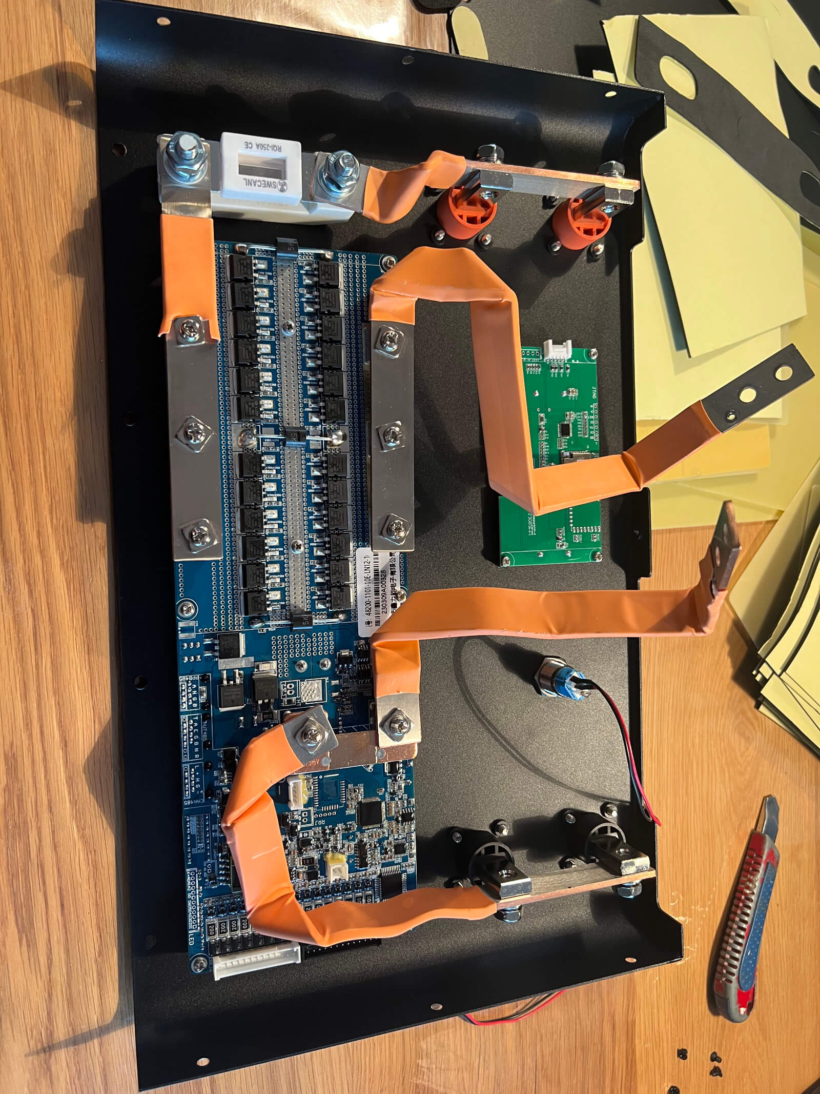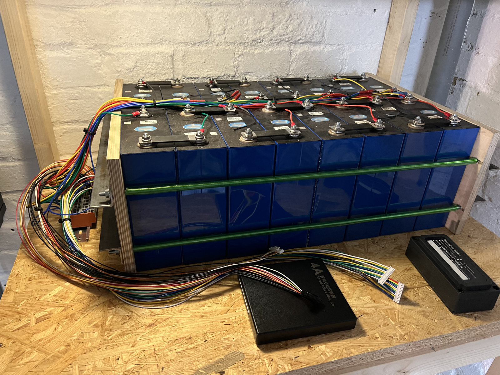 Die ersten 16 aus China importierten Lifepo4 Zellen. In einem Eigenbau Kompressionsgehäuse und mit Active-Balancer.