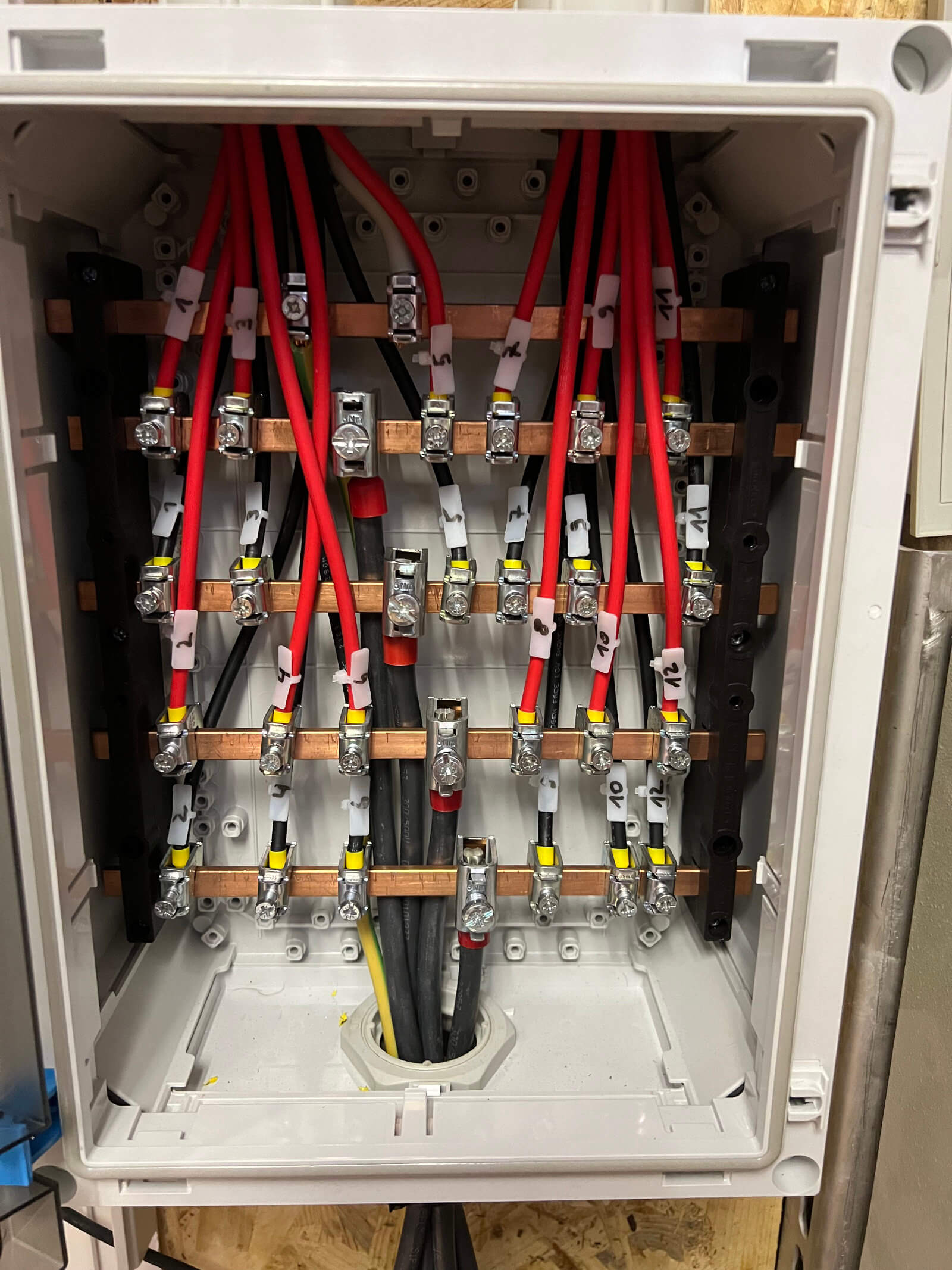 Vorbereiten der 13 Strings / Anschluss an die DC-Sicherungen. Es gibt zwei Sicherungskästen (nur einer ist auf dem Foto sichtbar).
