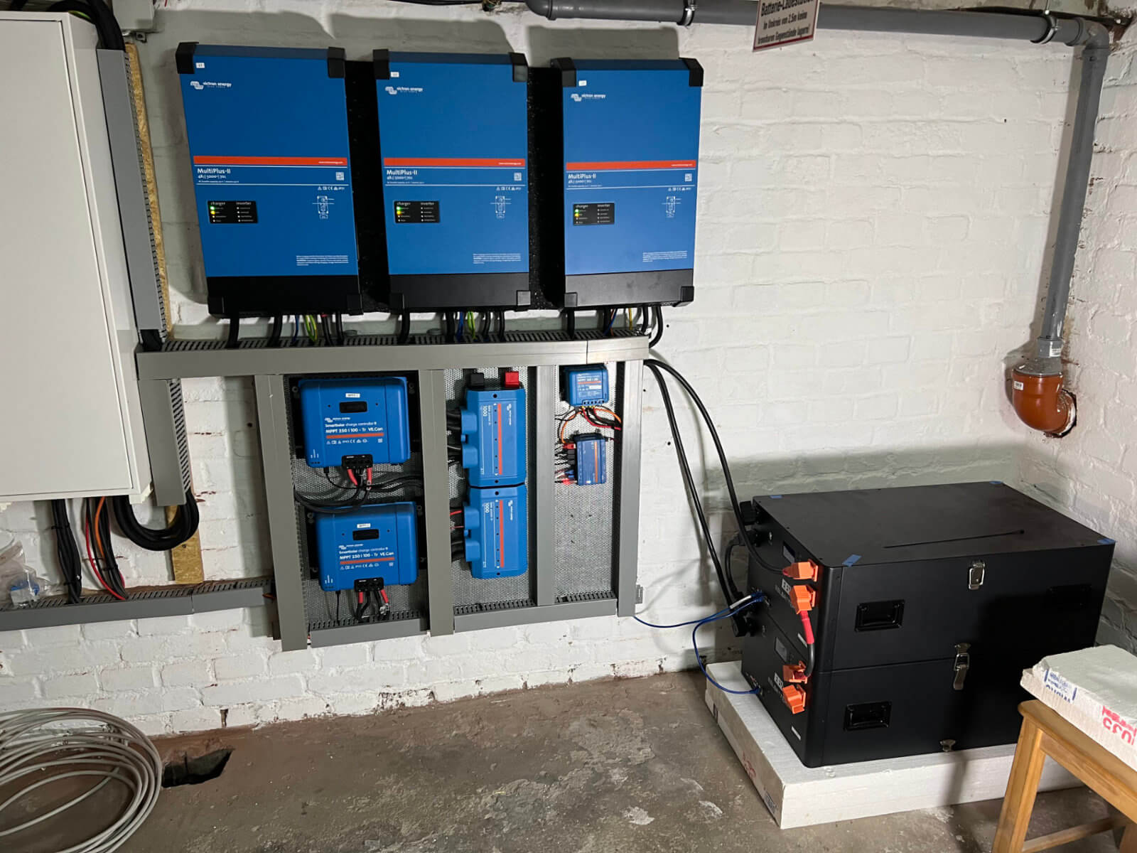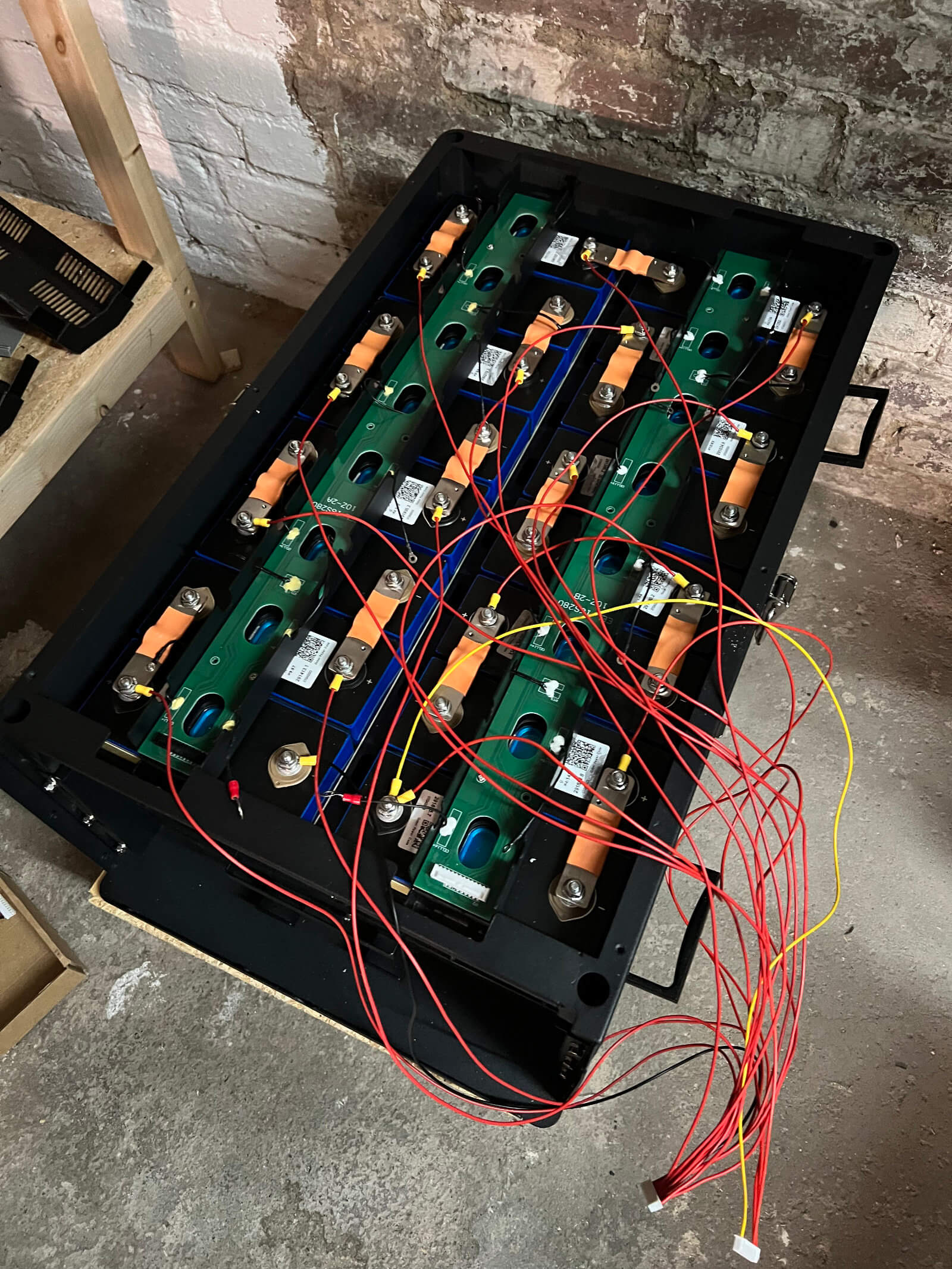 Der erste Versuchsaufbau im Keller. Eigenbau Regal und eigenes Kompressionsgehäuse für die Batterien.