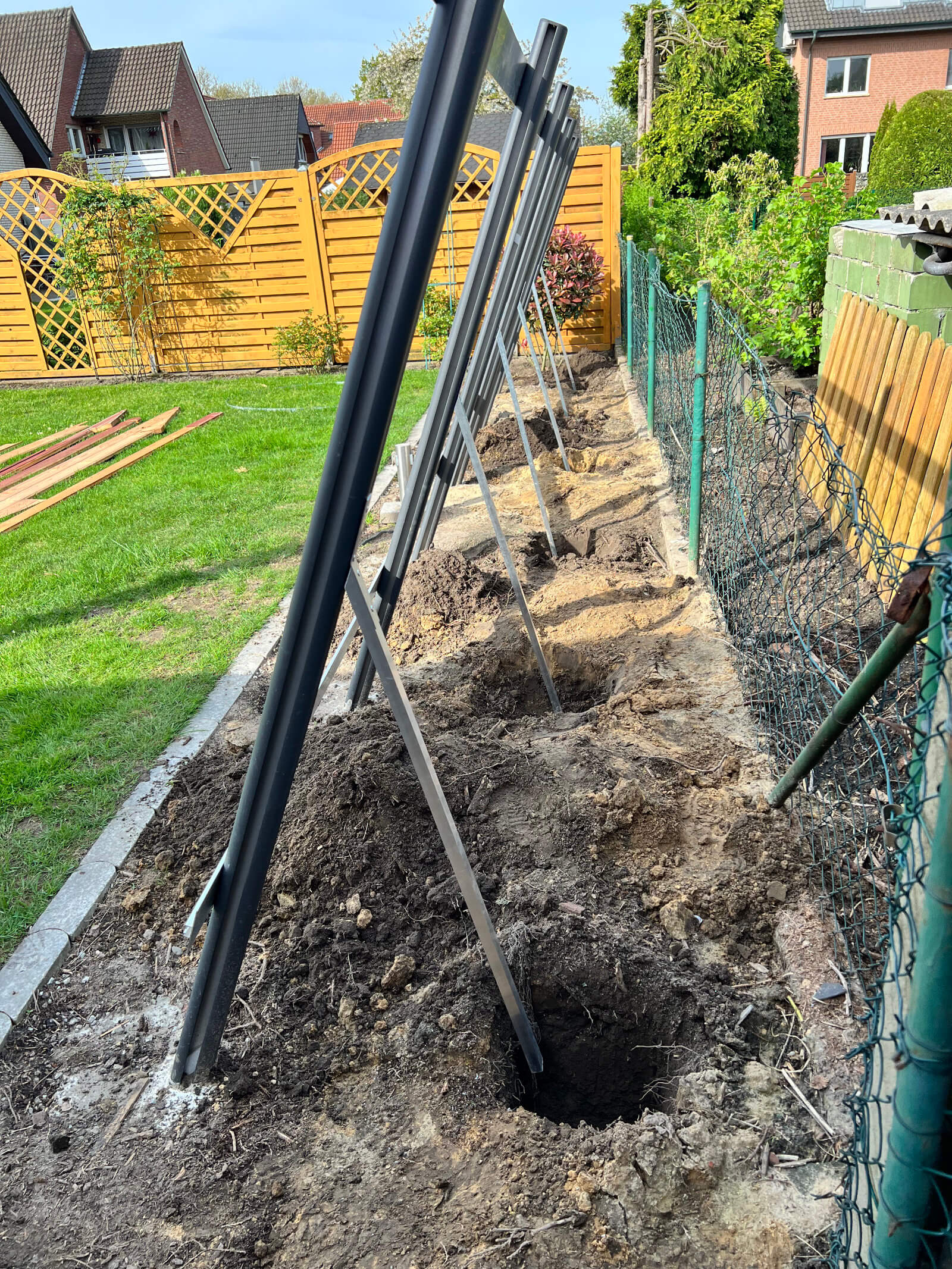 Alu-Zaun-Pfosten 80 cm tief, 40x40 cm, 20 Grad Neigung. Mit Verstärkung. Hält bombenfest.
