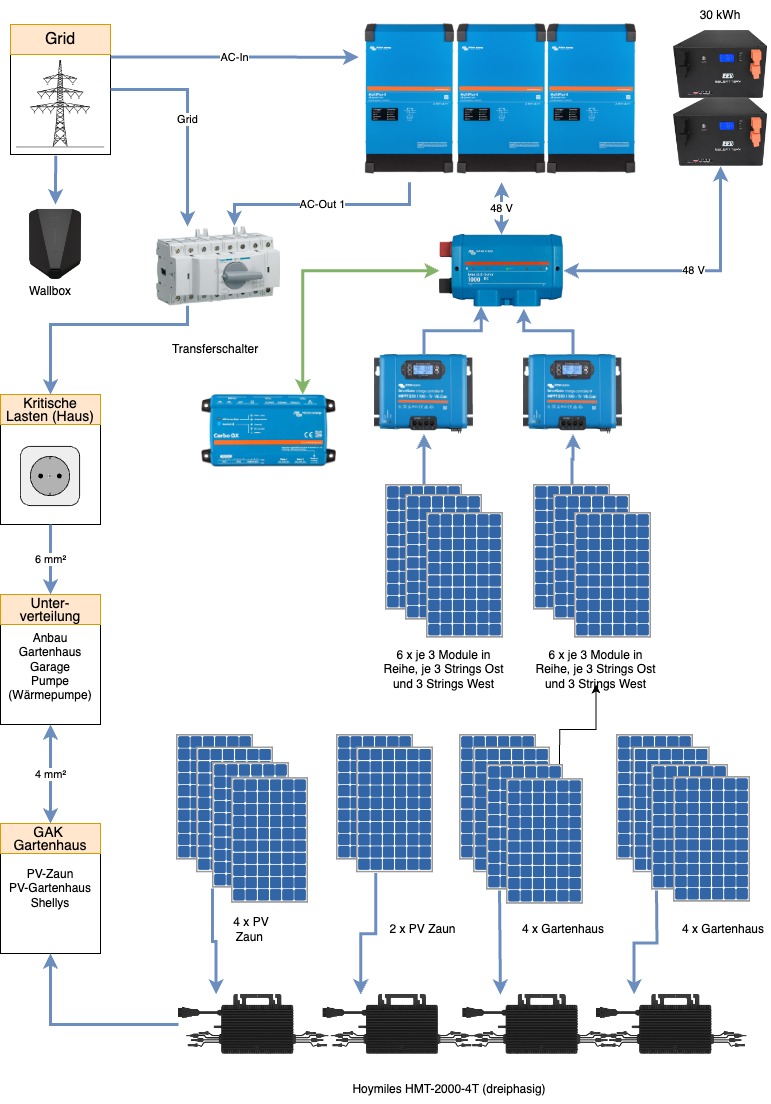 Mit zwei Strings je 35 mm2 von hier aus in den Keller. Je 3 Strings Ost und drei Strings West zu einem String parallel auf eine Sammelschiene angeschlossen. Ein MPPT kann nur 5500 Watt, durch die Multistring-Verschaltung erhoffe ich mir eine optimale Ausnutzung der MPPT.